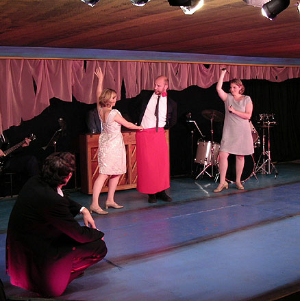 Courtney Cook, Kevin Rockower, and Erin Jerozal dance The Bulls as Michael Mendiola looks on. Photograph by Liz Lammer. Previous · Next Return to Photograph Index