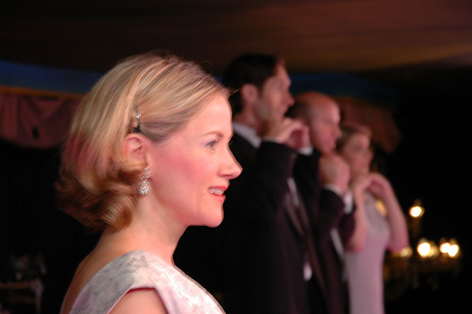 Courtney Cook sings a verse from Brussels as the Company dances to the side. Photograph by Stephen Sunderlin. Previous · Next Return to Photograph Index