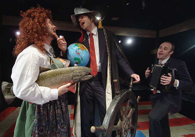 Alex Smith as Sophia, John Patrick as Amerigo Vespucci, and Corey Patrick playing accordion sing about Amerigo's early contributions to the discovery of America to the tune of the Gilligan's Island theme song.