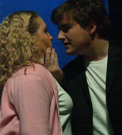 Demetrius (Reilly White) theatens Helena (Jennifer White) with "mischief in the wood" if she continues to follow him in his search for Hermia.