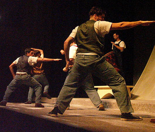 The Athenian artisans -- the cast of "Pyramus and Thisbe" dance a Bergomask for the court after their play has ended. Peter Quince (Jeff Washburn) plays the entire musical score on a drum.